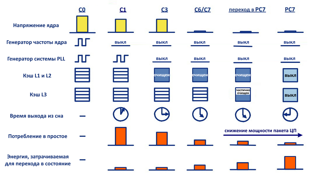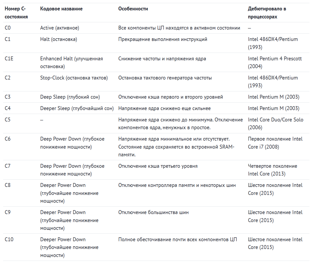С дальнейшим развитием процессоров появлялись следующие, более глубокие C-состояния. В каждом из них ЦП потребляли все меньше энергии, но взамен увеличивалось время, необходимое для возвращения к работе. Краткая информация о всех C-States представлена в таблице ниже.