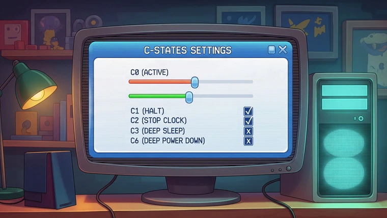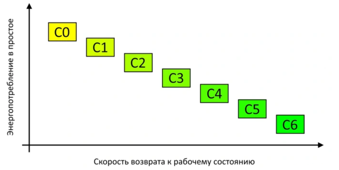 C-States — сокращение от «Core States», или «Состояния ядра». Когда процессор не занят вычислительной работой и находится в простое, эти состояния позволяют отключать или переводить в режим пониженного энергопотребления его различные компоненты. Например, тактовый генератор частоты, кэш и шины.
