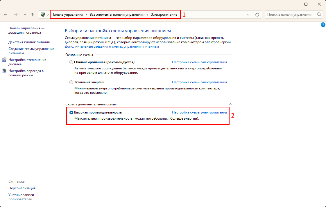 Закончив манипуляции, нажимаем клавишу F10 и соглашаемся сохранить изменения. Теперь все аппаратные «энергосберегайки» отключены. А чтобы Windows не пыталась снизить частоту процессора программным способом, в настройках электропитания устанавливаем режим «Высокая производительность».