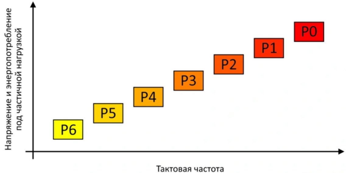 P-States — сокращение от «Performance States», или «Состояния производительности». Во время выполнения процессором вычислений эти состояния позволяют динамически изменять частоты его ядер, кэша и шин, а также питающее их напряжение. За счет этого при неполной нагрузке ЦП достигается экономия энергии.