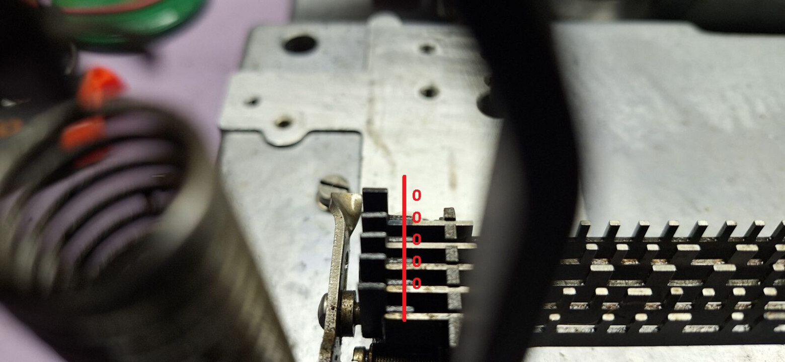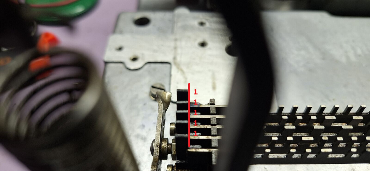 После сборки передающего узла также пришлось отрегулировать зазор между контактами у контактных пар. Для этого у каждого контакта предусмотрены 2 винта — регулировочный и стопорный. Для регулировки необходимо ослабить стопорный винт и регулировочным винтом выставить необходимый зазор. Слишком маленький зазор может приводить к ошибочной передаче лог. 1 (замкнутое состояние). Слишком большой зазор приводит к ложному появлению коротких всплесков лог. 0 между отдельными единичными битами. Зазор регулируется при передаче комбинации 11 111 (команда переключения на латинский шрифт). При регулировке можно вручную вращать ротор двигателя и визуально следить за контактами. Необходимо выставить такой зазор, чтобы при переходе передатчика от одного разряда к другому, первый контакт еще не разомкнулся, а второй уже замкнулся, чтобы было небольшое перекрытие между ними. После регулировки и проверки необходимо затянуть все фиксирующие винты.