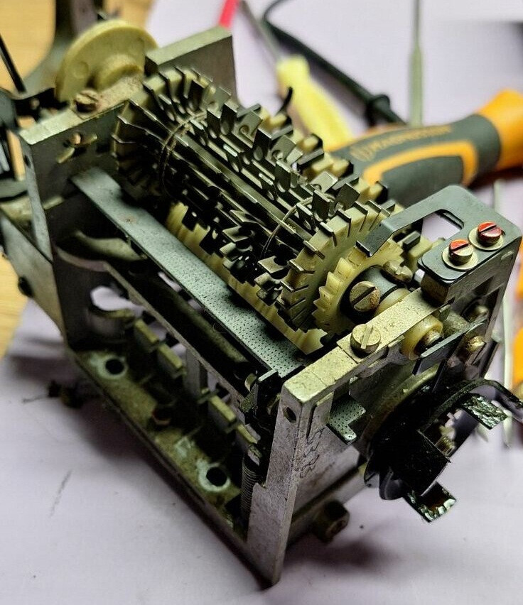 Приемник — следующий на очереди на отмывку. Если у передатчика для формирования кода Бодо было целых 5 контактов, то у приемника всего один электромагнит (на фото ниже — наверху, в центре), но зато с пятью якорями.