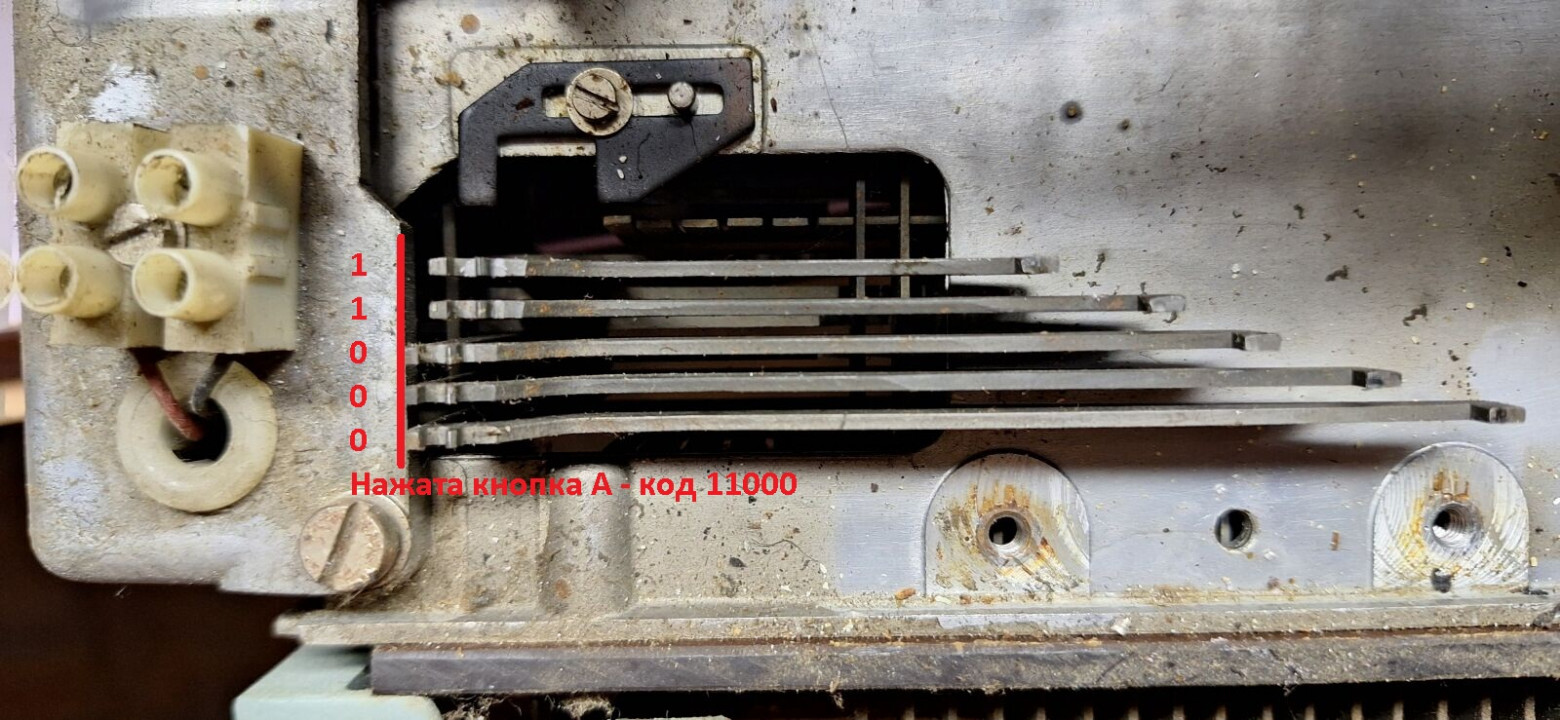 А коромысла управляются снизу пятью подвижными планками с упорами. При нажатии кнопки эти планки сдвигаются в одну из 32 комбинаций. Если упор не стоит под коромыслом, то, когда коромысло попадает в выемку кулачка, оно «проваливается» и контакт замыкается, формируется, допустим, лог. 1. Если под коромыслом оказывается упор, то «провала» не происходит и контакт остается в разомкнутом состоянии и формируется лог. 0. После завершения цикла все планки сдвигаются в исходное состояние и аппарат готов принять очередной символ.