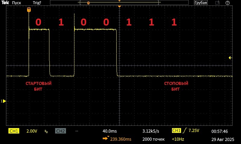 Собрав все назад можно убедиться что узел передатчика работает! Сначала я его проверил осциллографом, подключив контакты к источнику питания через нагрузочный резистор 220 Ом. Осциллограмма для буквы А имеет следующий вид (на длительность импульсов и всей посылки пока внимание не обращать, частота вращения двигателя не соответствует номиналу):