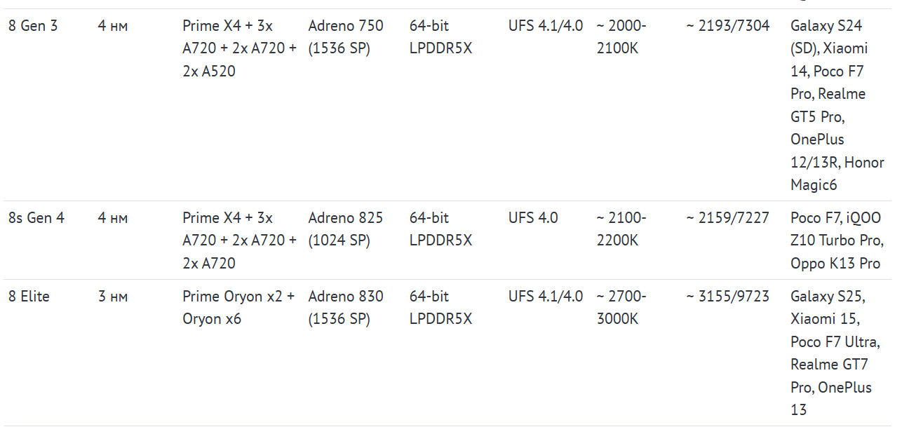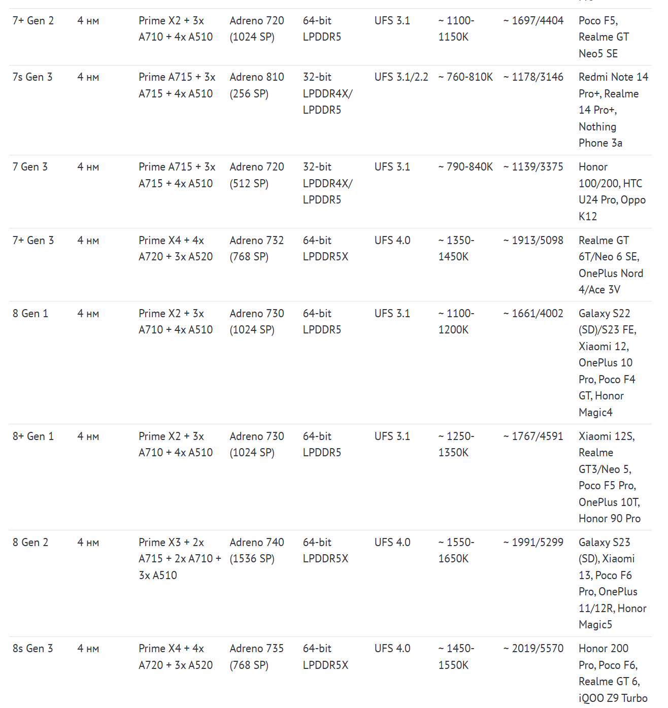 Чтобы разница между актуальными линейками и моделями Snapdragon была наиболее понятна, сравним их технические характеристики и результаты тестов в популярных бенчмарках в таблице ниже.