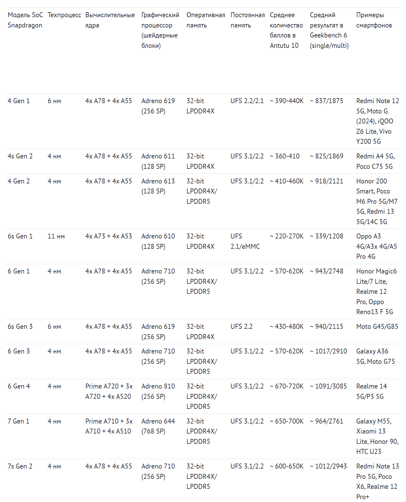 Snapdragon 4/4s — SoC с графикой базового уровня, имеющей 128 S С современными играми справляются только на «минималках». Исключение — модель 4 Gen 1, имеющая 256 SP.