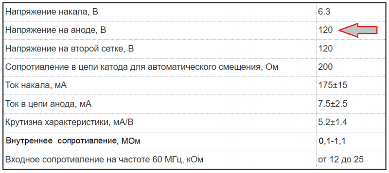 Из всех её многочисленных параметров отмечу только те, которые нам нужны будут позже. Это номинальное напряжение на аноде – 120 В и ток в цепи анода от 5 до 10 мА.