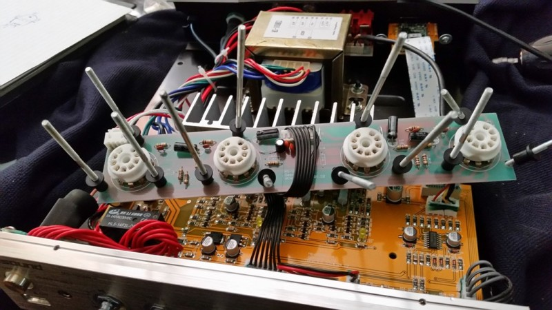 По фотографиям прекрасно видно, что это полноценный полупроводниковый усилитель, который радует глаз меломанов наличием 4-х светящихся радиоламп, размещенных на обособленной плате. Плата подключена к усилителю шлейфом, по которому на лампы подается накал и проходят транзитные линии питания каких-либо узлов усилителя, чтобы с извлеченными лампами он не работал. Естественно, что участия в работе усилителя они не принимают.
