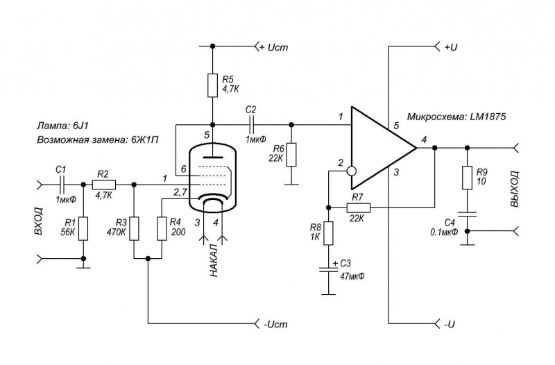 И да, так и есть, сигнал с выхода усилительного каскада, собранного на лампе 6Ж1П (анод лампы, 5-й вывод по схеме) поступает для дальнейшего усиления на выходной каскад, собранный на микросхеме LM1875 (вход 1 по схеме). То есть получается, что это не ламповый, а гибридный усилитель.