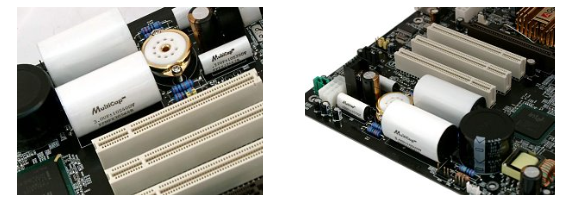 Плата под сокет 478. Необычно в ней то, что для звука используется ламповый усилитель. Лампа произведена фирмой SOVTEK в России, и относится к hi-end сегменту.