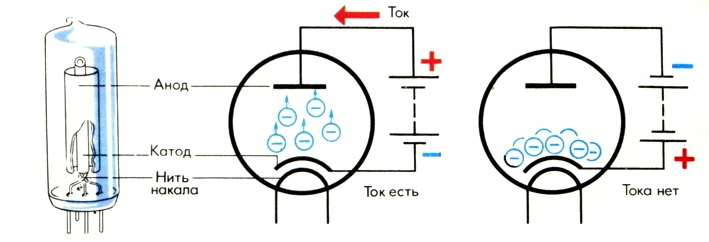 Если на анод диода подать положительное напряжение, а на катод отрицательное (прямой полярности), то электроны под действием электрического поля начнут перемещаться от катода к аноду и через диод протечет ток. Если на диод подать напряжение обратной полярности, то электрическое поле будет пытаться перемещать электроны от анода к катоду. А поскольку анод не может излучать электроны, то и движения в этом направлении электронов не будет, и ток будет отсутствовать.