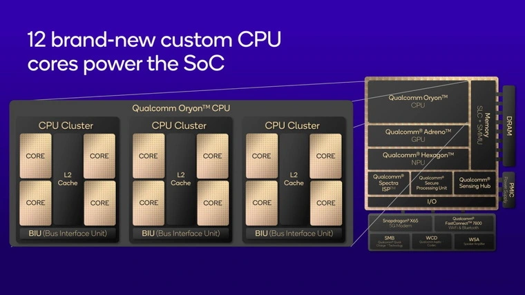В отличие от стандартных ядер ARM, которые делятся на «малые» и «большие», ядро Oryon разрабатывалось с учетом как максимальной производительности, так и высокой энергоэффективности. Линейка чипов Snapdragon X получила от 8 до 12 таких ядер.
