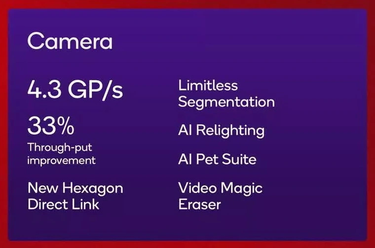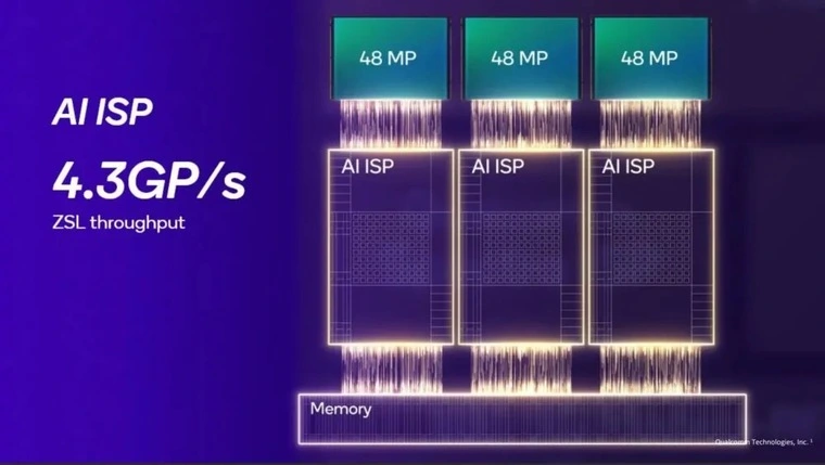 Hexagon связан с блоком Spectra. Это процессор обработки изображений (ISP), который состоит из трех блоков. В этом поколении производительность Spectra увеличилась до 4300 Мп/c. За счет этого блок умеет обрабатывать картинку с частотой 30 кадр/c сразу с трех 48 Мп сенсоров одновременно. У Snapdragon 8 Gen 3 в сравнимых условиях поддерживались сенсоры на 36 Мп.