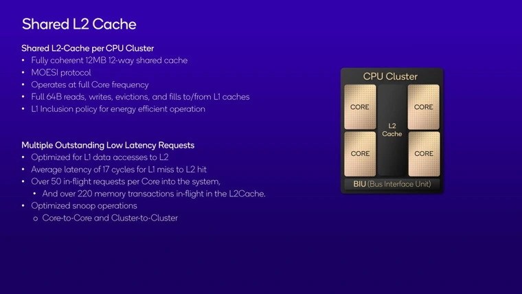Одним из ключевых отличий от других SoC здесь является система кэширования. Обычно используется классический подход: маленький L1 и небольшой L2 для каждого ядра, и большой общий L3 для всех ядер. Здесь у ядер старшего кластера довольно вместительный кэш L1I объемом 192 Кб для инструкций, и вдвое меньший L1D для данных.