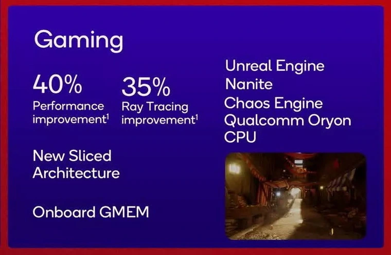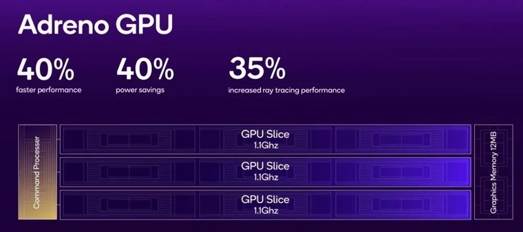 Дополнительный плюс — сниженное энергопотребление. Слайсовая архитектура позволяет полностью отключать фрагменты ГП, когда в них нет нужды. При запуске игр с относительно несложной графикой часть нового Adreno остается неактивной, позволяя заметно продлить время работы от батареи в играх — по заверениям Qualcomm, до двух с половиной часов. Приводятся и другие цифры: при снижении производительности до уровня Adreno 750 новый ГП потребляет на 40 % меньше энергии.