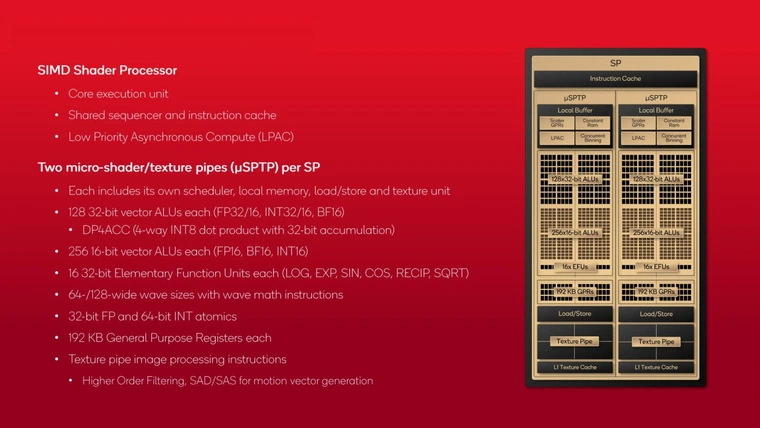В одном μSPTP находится 128 блоков FP32 и 256 блоков FP16. Помимо этого, в его состав входят четыре текстурных модуля (TMU), блок трассировки лучей, 16 блоков работы со сложными инструкциями (EFU — аналог SFU у ГП NVIDIA), регистровый файл объемом 192 Кб и небольшой текстурный кэш.