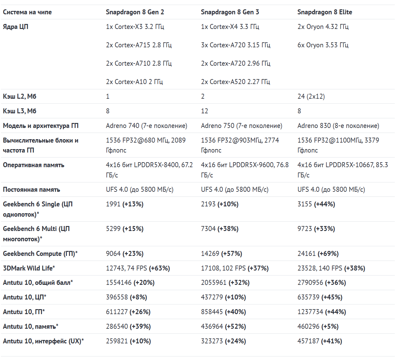 * в скобках результатов бенчмарков указан процентный прирост по сравнению с предыдущим поколением SoC.