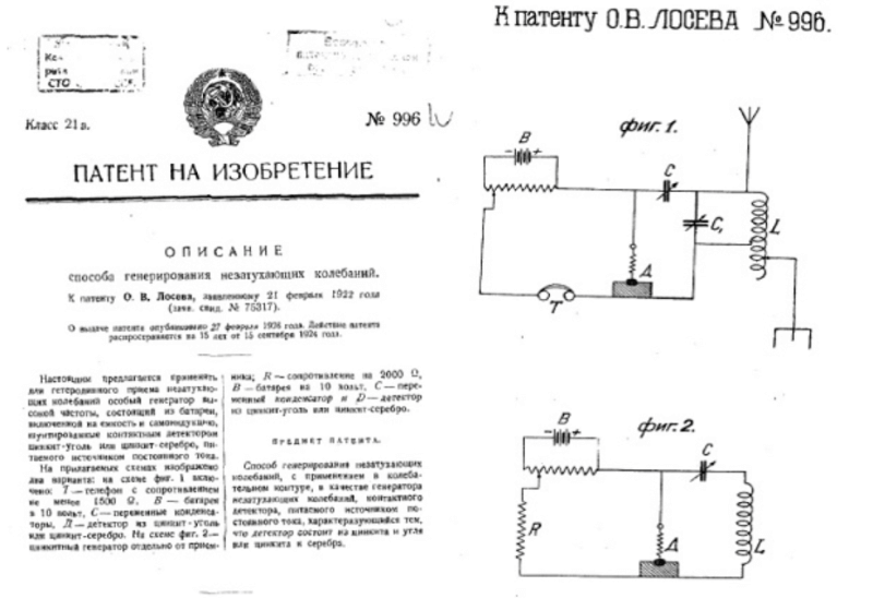 Попытки создать твердотельный усилитель предпринимались и в СССР. В 1922 году Олег Лосев приблизился к изобретению транзистора — он разработал первый двухтерминальный полупроводниковый прибор. Однако дальнейших исследований это изобретение не повлекло — устройство было нестабильно, а сама физика явления не до конца понятна.