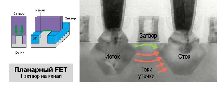Уменьшение длины затвора приводило к тому, что канал становился слишком тонким. Как итог — самопроизвольное туннелирование электронов от истока к стоку. Проще говоря, даже при закрытом кране у вас все равно была утечка. Дополнительно из-за уменьшения площади затвора падала и эффективность управления каналом. Транзистор переставал быть контролируемым.