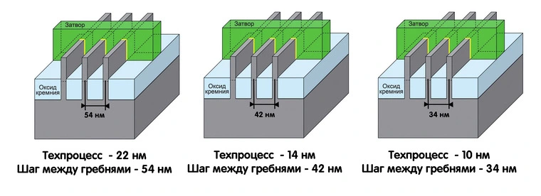 Во-вторых, существенно повысилась эффективность управления, поскольку затвор «обволакивает» канал с трех сторон, а не с одной как это было у планарной технологии. Производители часто используют конструкции с 2–3 гребнями, что позволяет увеличить ток транзистора. Разрешение фотолитографического оборудования влияет непосредственно на шаг между гребнями.