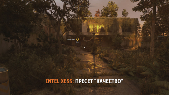 Тут XeSS отлично обрабатывает перила: в полном кадре благодаря штатному сглаживанию они местами пропадают, а в варианте с FSR — начинают мерцать. А вот колышущаяся трава на крыше, как мы уже видели ранее, обрабатывается отвратительно, и местами смазывается до полного исчезновения.