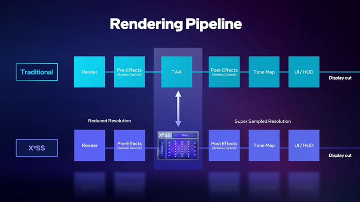 Кроме того, XeSS вклинивается в конвейер рендеринга изображения, заменяя собой штатное сглаживание. Собственно, даже две буквы S в названии здесь означают суперсэмплинг, как и у Nvidia. И это — действительно большой плюс.