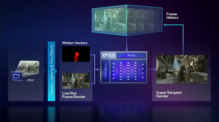 Если FSR и RSR от AMD основываются на пространственном масштабировании (хотя и со множеством фирменных улучшений), то XeSS использует алгоритмы искусственного интеллекта. Как и у Nvidia, модель масштабирования тренируется на суперкомпьютерах Intel. Она изучает кучу кадров из игр в низком и высоком разрешениях, чтобы потом воспроизвести результат на локальном компьютере.