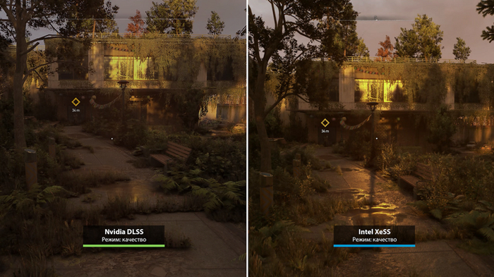 Здесь можно заметить качество текстур плит на дорожке: в варианте с XeSS они сильно замылены, а края луж, наоборот, пикселизированы, хотя до явных лесенок еще далеко. Но что более заметно — колышущаяся трава в варианте с ИИ-апскейлом начинает смазывать объекты, находящиеся на заднем плане. Очередной пример косяков при обработке движущихся объектов, но далеко не последний.
