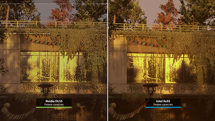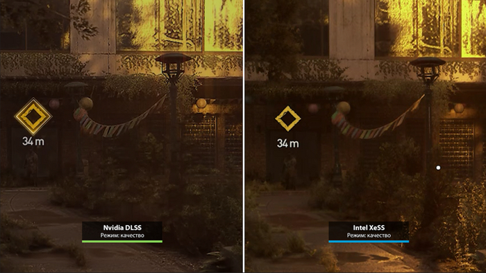 И не отходя от кассы — посмотрите на движение травы на той же крыше: вполне очевидно, что с ней DLSS справляется гораздо лучше. Да и не только с ней, коли уж на то пошло. Посмотрите на гирлянду из флажков. Нет, не на ту, что под крышей, а на ту, что натянута между фонарями. Она превращается в цветную кашу в варианте с XeSS. Это уже не размытие на дальней перспективе, а реальная проблема обработки движущихся объектов технологией Intel, которая еще не раз всплывет позже.