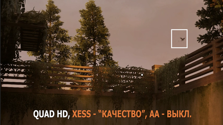 Но у нас тут есть и динамический объект, хоть он и движется по заданной траектории. Вертолет изначально нарисован не слишком детализированным, но с XeSS он еще больше рассыпается и периодически оставляет за собой шлейфы из остаточных изображений.