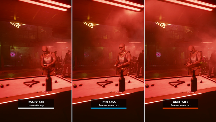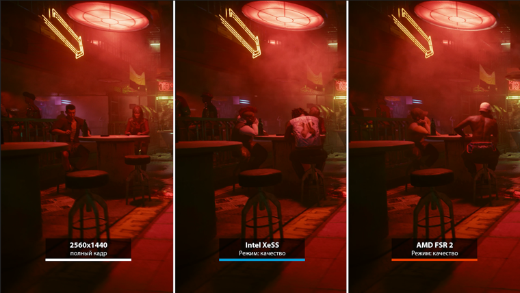 При этом в статике заметной разницы в качестве нет, да и с глубиной сцены технология Intel справляется отлично — бутылки в баре хорошо это доказывают. А если очень хорошо присмотреться, можно заметить, что шлейфы за силуэтами NPC оставляет и DLSS. В гораздо меньших объёмах, конечно.
