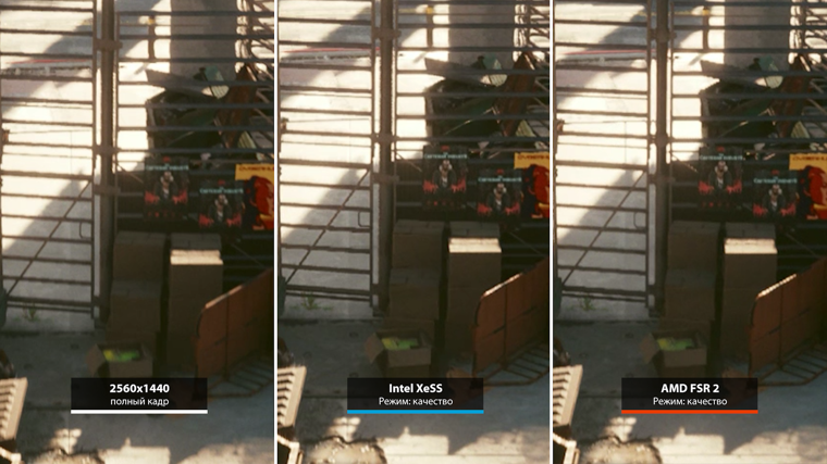 Примерно то же мы видим на прутьях забора. XeSS отрисовывает их далеко не идеально, но лучше, чем полный кадр и FSR 2.1. А что еще любопытнее — гораздо лучше он работает с постерами у забора.