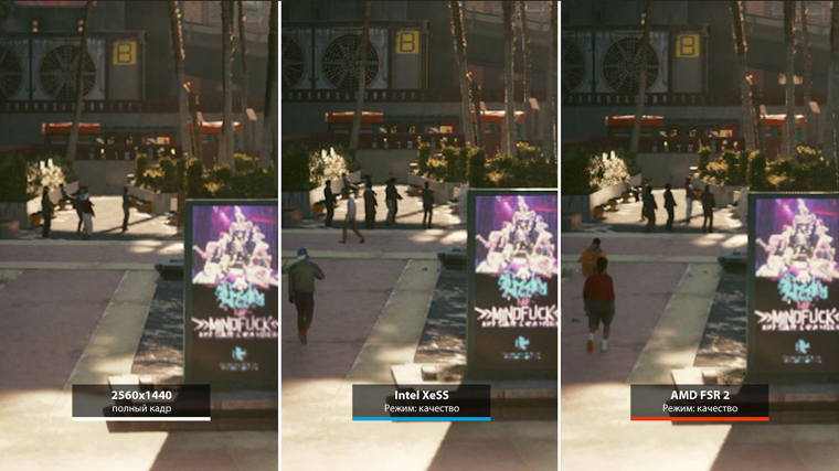 Еще можно заметить, насколько четче с XeSS смотрится текст и графика на рекламном стенде, а также насколько лучше от отрабатывает дальний план улицы.