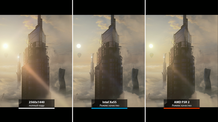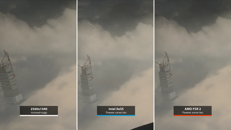 Если FSR в открывающей катсцене встречает нас косяками с отработкой прозрачности облаков и дрожащим фасадом небоскреба, чего нет при задействовании XeSS...