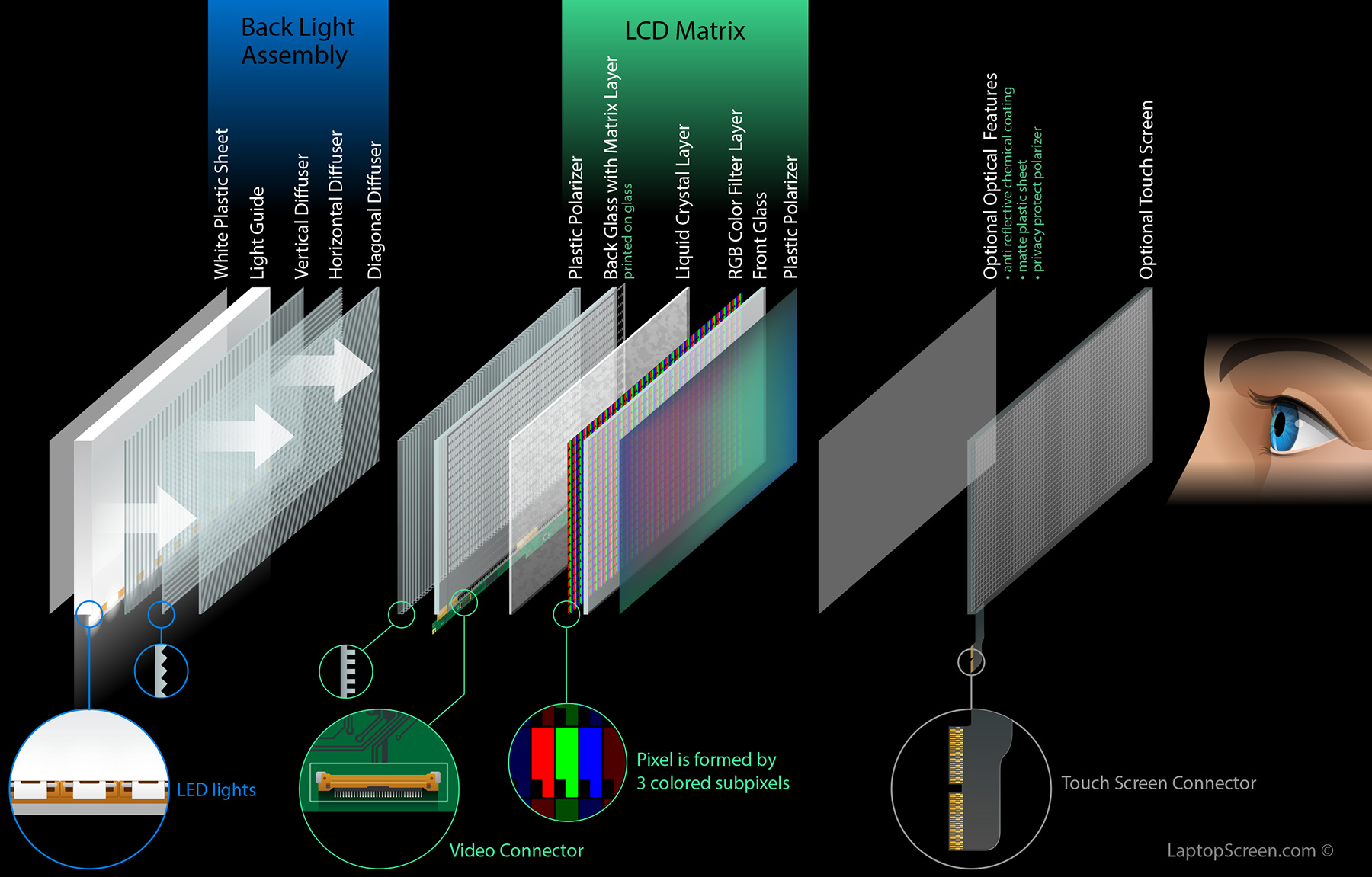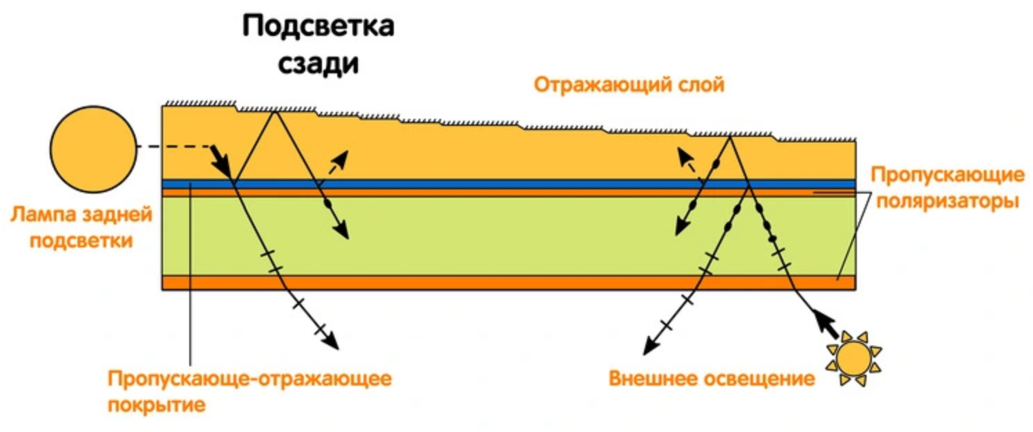 Как можно понять из названия, задача этой части ЖК-экрана — получить равномерное освещение, выдаваемое источником света. Первый слой — отражающий, обычно представляет из себя комбинацию белого пластика и фольги. Следующим идет световод.