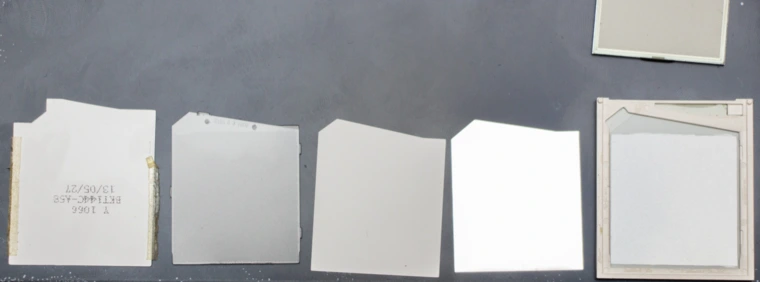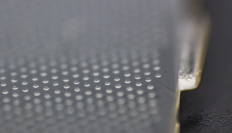 Можно подумать, что эффект «капель воды» дает антибликовое покрытие, но нет. Это вид со стороны подсветки. Мельчайшие неровности находятся на поверхности первого слоя TFT-панели — поляризующей пленки, которая приклеена к стеклянной подложке. Основную работу по поляризации в дешевой поляризующей пленке выполняют атомы йода, вшитые внутрь полимера. А за счет 15-кратного вытягивания пленки молекулы полимера ориентируются в пространстве, и пленка получает свойства линейного поляризатора.