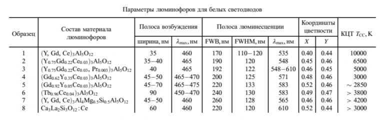 Обычный люминофор для белых светодиодов состоит из множества редкоземельных металлов: иттрий, гадолиний, церий, тербий, лантан.