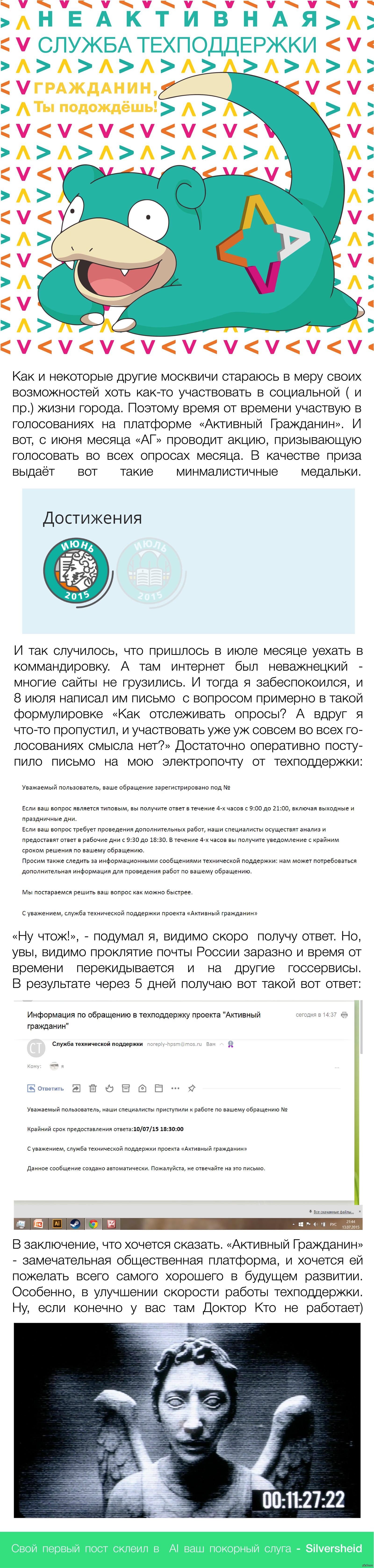 Silversheid 10 лет назад Техподдержка платформы Активный Гражданин Люблю подобные общественные платформы. Но иногда они работают как почта России... [моё] Гражданская позиция И пусть весь мир подождет Длиннопост