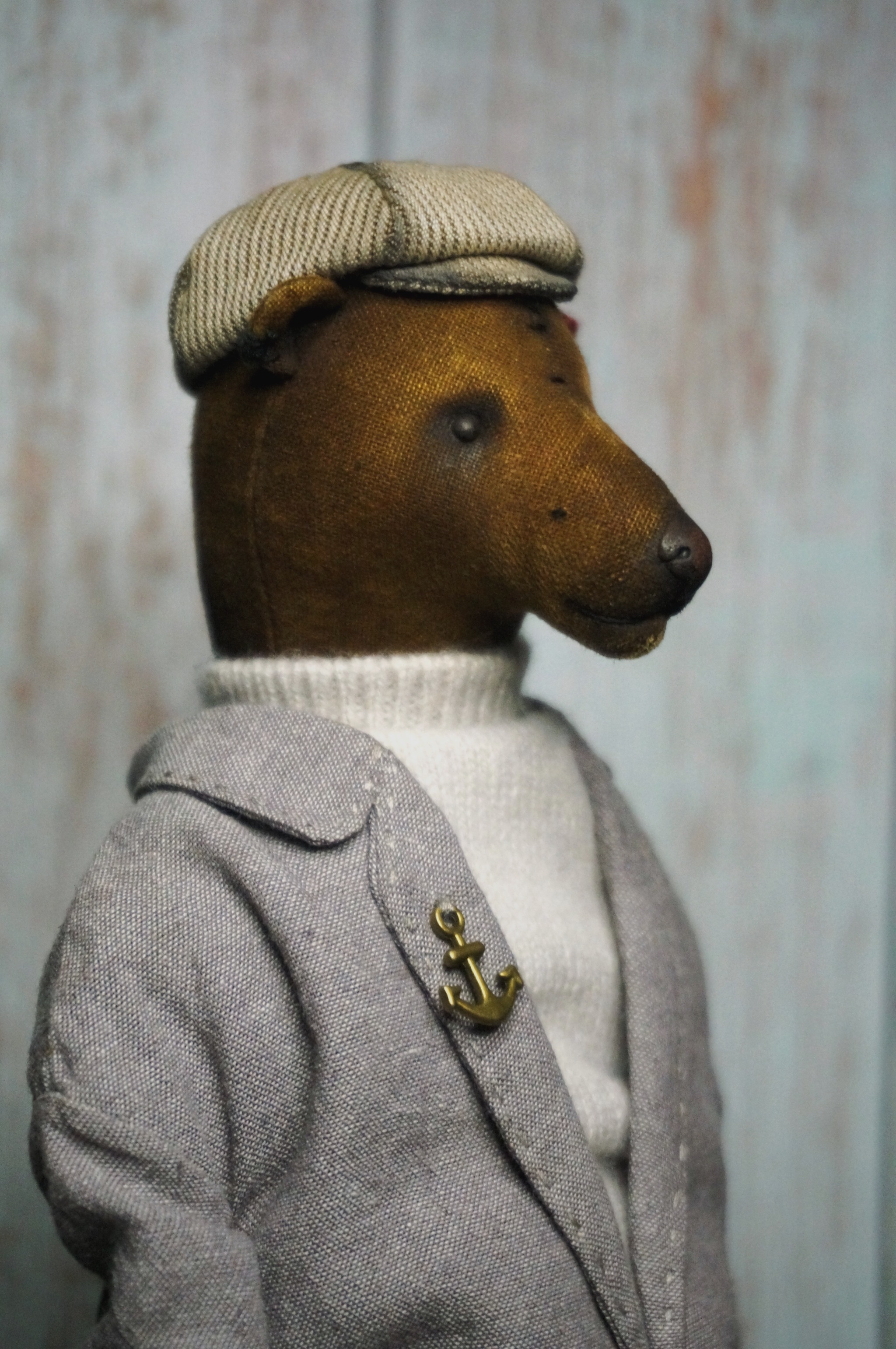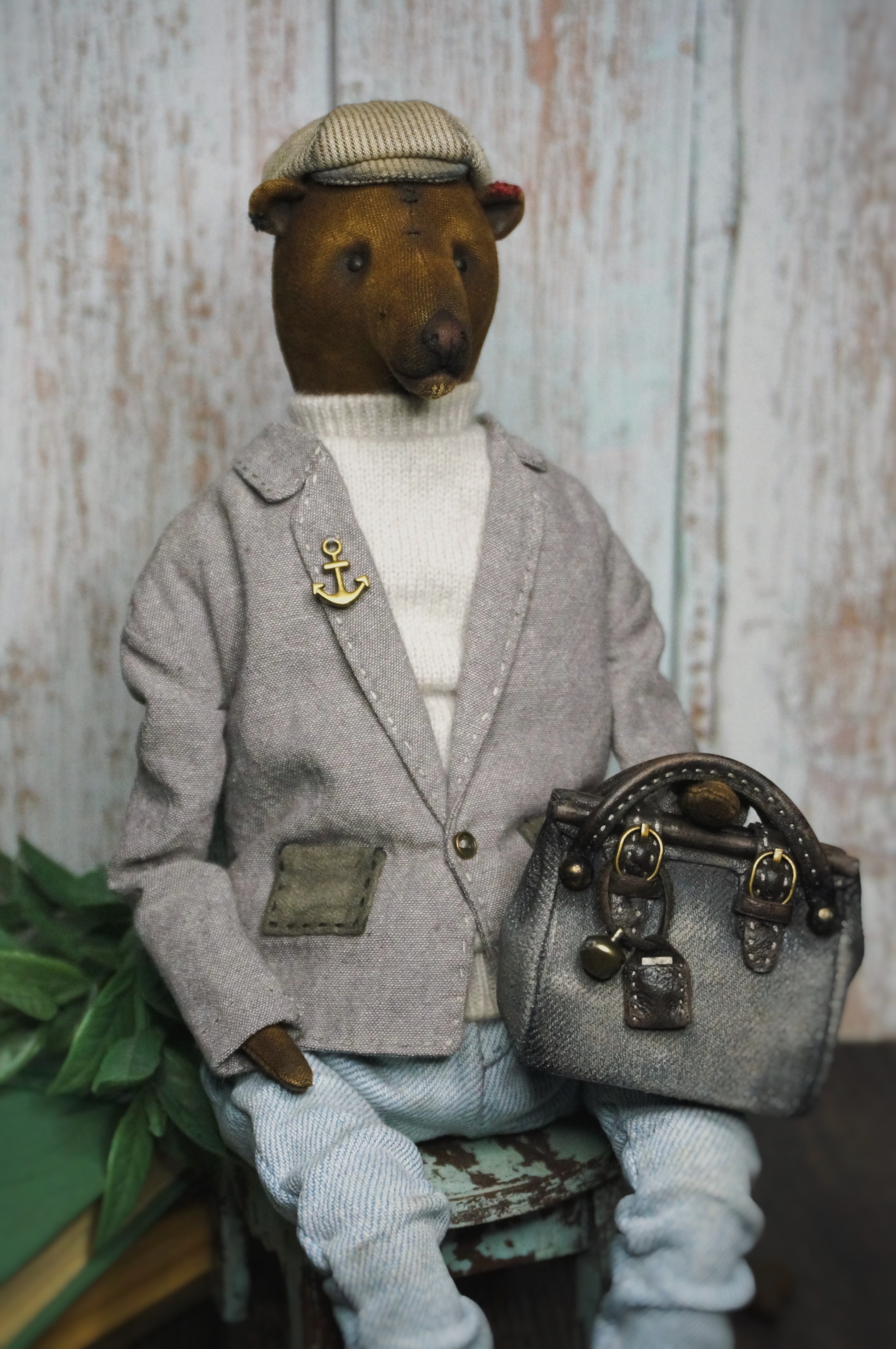 Сшит полностью вручную, с вниманием к каждой строчке. Ткань мягкая, но плотная, приятная на ощупь. Леонид умеет сидеть и смотреть с таким философским выражением, будто размышляет о путешествиях... и ценах на мёд.