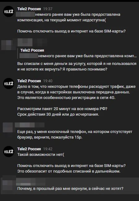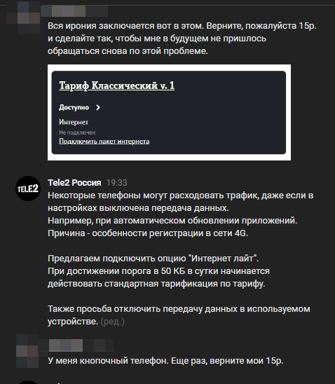 P.S.: Техподдержка вместо возвращения нечестно списанных денег, предлагает подключить пакет 50 минут на все номера РФ. После этого, мне кажется, что агент техподдержки просто ненормальный.