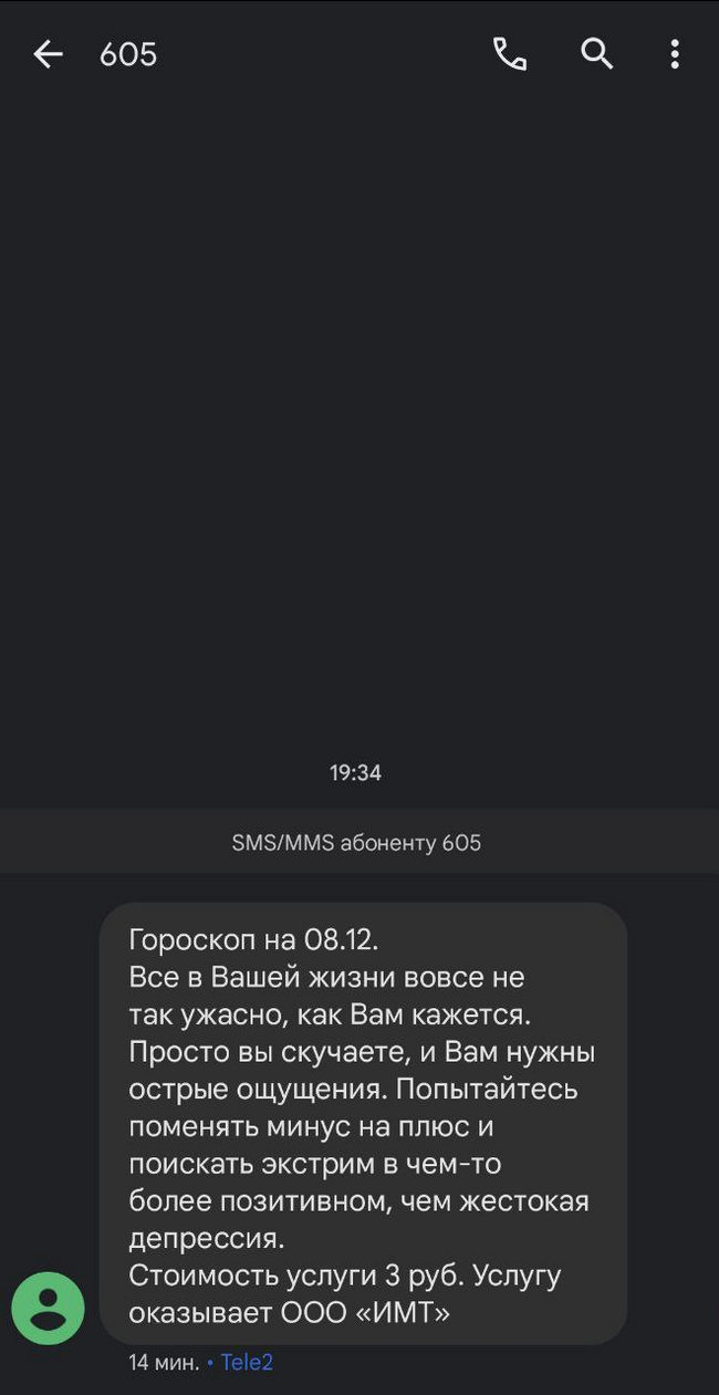 Здравствуйте! Сижу, кушаю шавуху, никого не трогаю, и тут прилетает мне SMS с гороскопом на сегодня