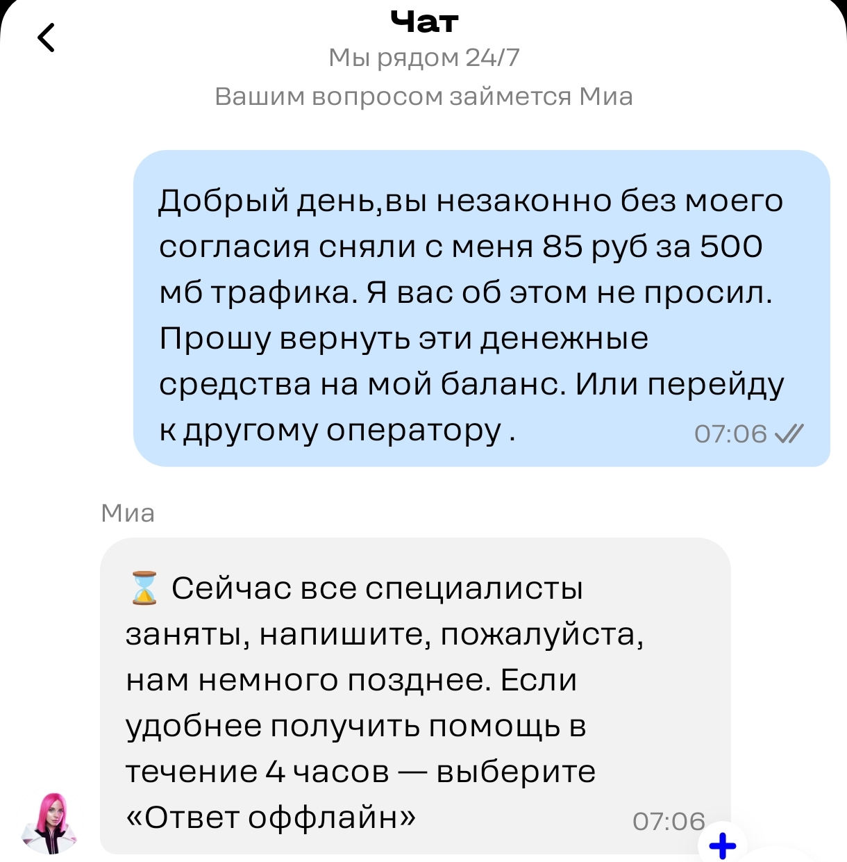 Пишу им в чат поддержки и мне приходит интересный ответ.Почему не позвонил сам оператору,да потому что в прошлый раз 25 минут висел на линии ,а сейчас не хочу тратить на это время.Видимо и до теле 2 докатилась оптимизации специалистов. Наверное пора уходить к другому оператору.Хотя раньше с этим оператором особых проблем не было,ну по крайней мере у меня.Тем более с нового года на тариф подняли оплату больше чем 100 руб.