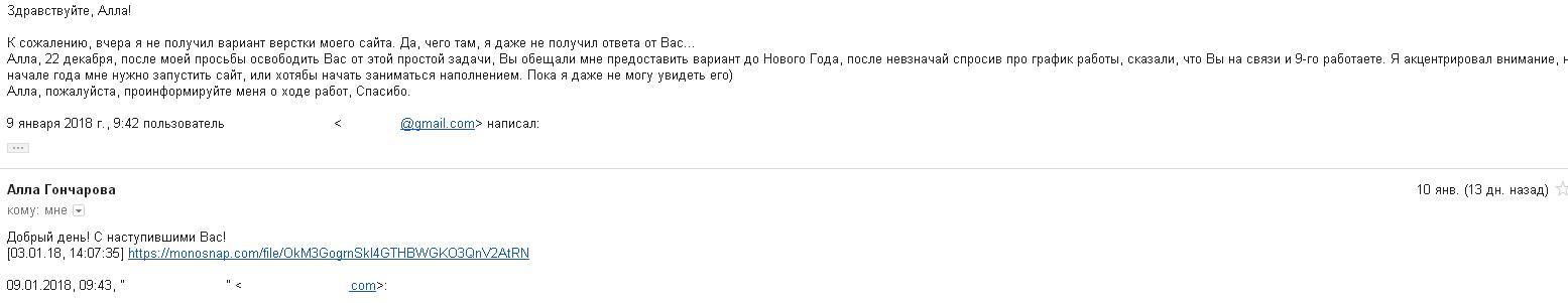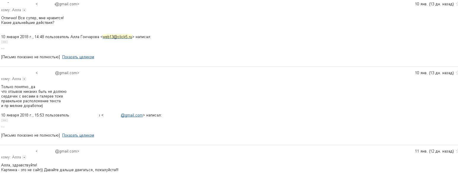 По итогу, беседа с ней проходила тоже по телефону (повторюсь записано), по почте это в основном - "Мне нужно связаться с вами, нужно открыть сайты, нужно пройтись по вашим сайтам и ТЗ..." не буду прикладывать скрины. Далее идет долгая и мучительная неделя непонимания желаний заказчика. Долгие телефонные разговоры, рассказ об очевидных вещах, океан воды в беседе. Вместе не можем понять, зачем же в компании нужны дизайнеры, и вообще похоже там программист, дизайнер, менеджер проекта - это один человек. Алла уверяет меня, что стоимость проекта посчитана не верно, все что я рассказываю, это абсолютно другие цифры, доп, доп, доп, доп и т.д.. В общем путем долгих консультаций - что такое сайт, а также убеждений в критически сложном строении моего сайта, я рисую сайт карандашом самостоятельно и отправляю, настоятельно прошу Аллу - "Не копировать мой рисунок, а согласно пожеланиям сделайте грамотный сайт!"