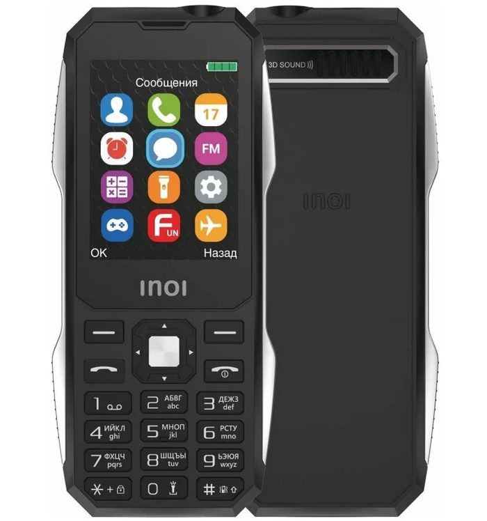 Сотовый от отечественного производителя INOI попал в подборку не только из-за патриотических чувств. Брендом он рекламируется как звонилка для военнослужащих и по факту вполне соответствует этому званию. Имеется усиленный корпус с металлическими вставками и спинкой из матового пластика, что обеспечивает цепкий хват. Крупный 2.4-дюймовый экран яркий и хорошо читается на солнце. Функционал, что называется – ничего лишнего: два слота под симки, радио и достаточно приличный фонарик, бьющий на пару метров вдаль.