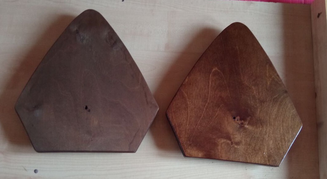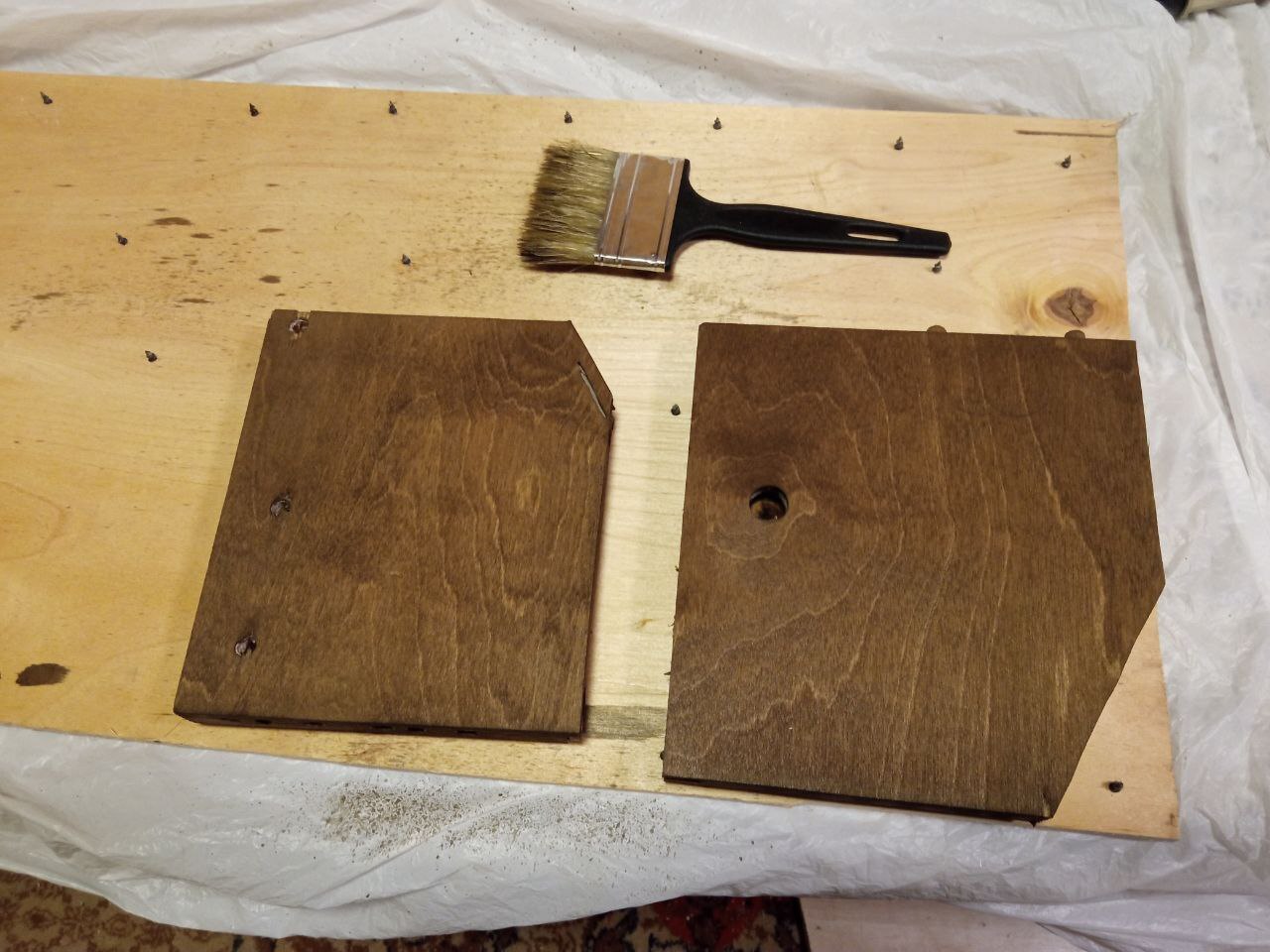 Пошел покупать морилку. Выбирал между дешевыми и дорогими, в итоге остановился на морилке Радуга-21, цвет дуб. Попробовал сперва на обрезках, покрыл 1 слоем, предварительно зашкурив фанеру, получилось красиво и я решил, что надо брать.