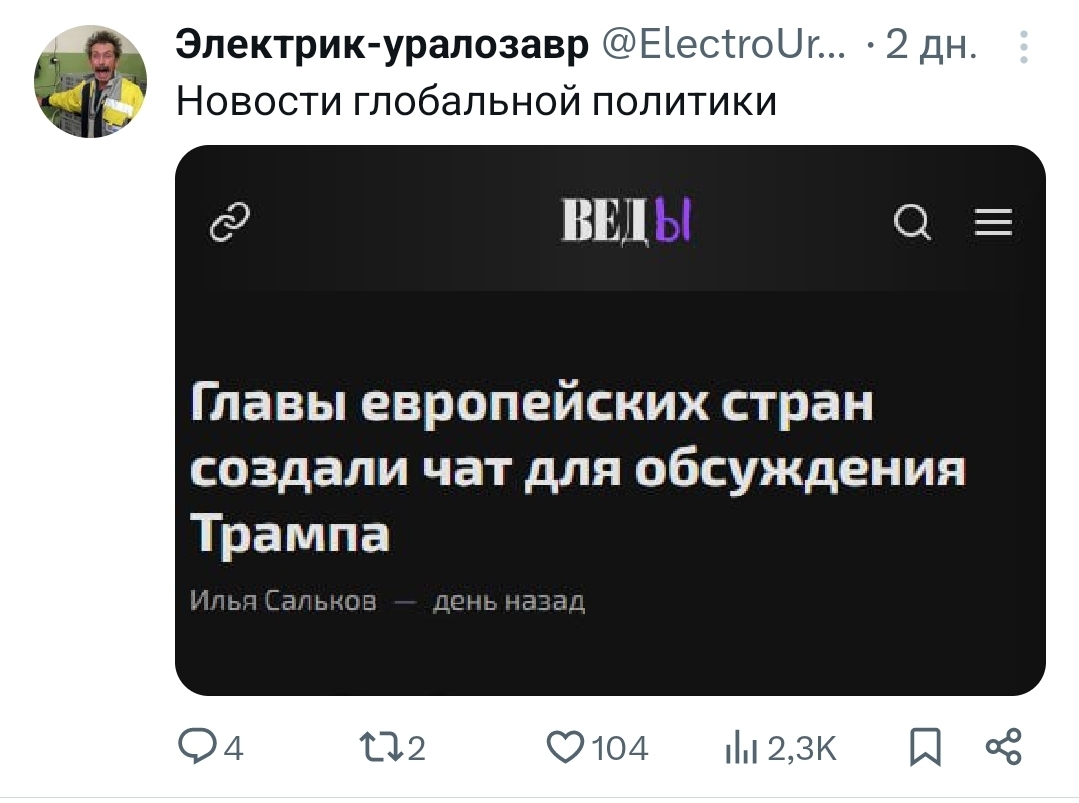 68 SvenDuden Юмор для всех и каждого Политика Тема достойна отдельного чата Серия Электрик-уралозавр 2 дня назад Fake News Юмор X (Twitter) Политика Дональд Трамп Чат Скриншот 22 Ещё 0