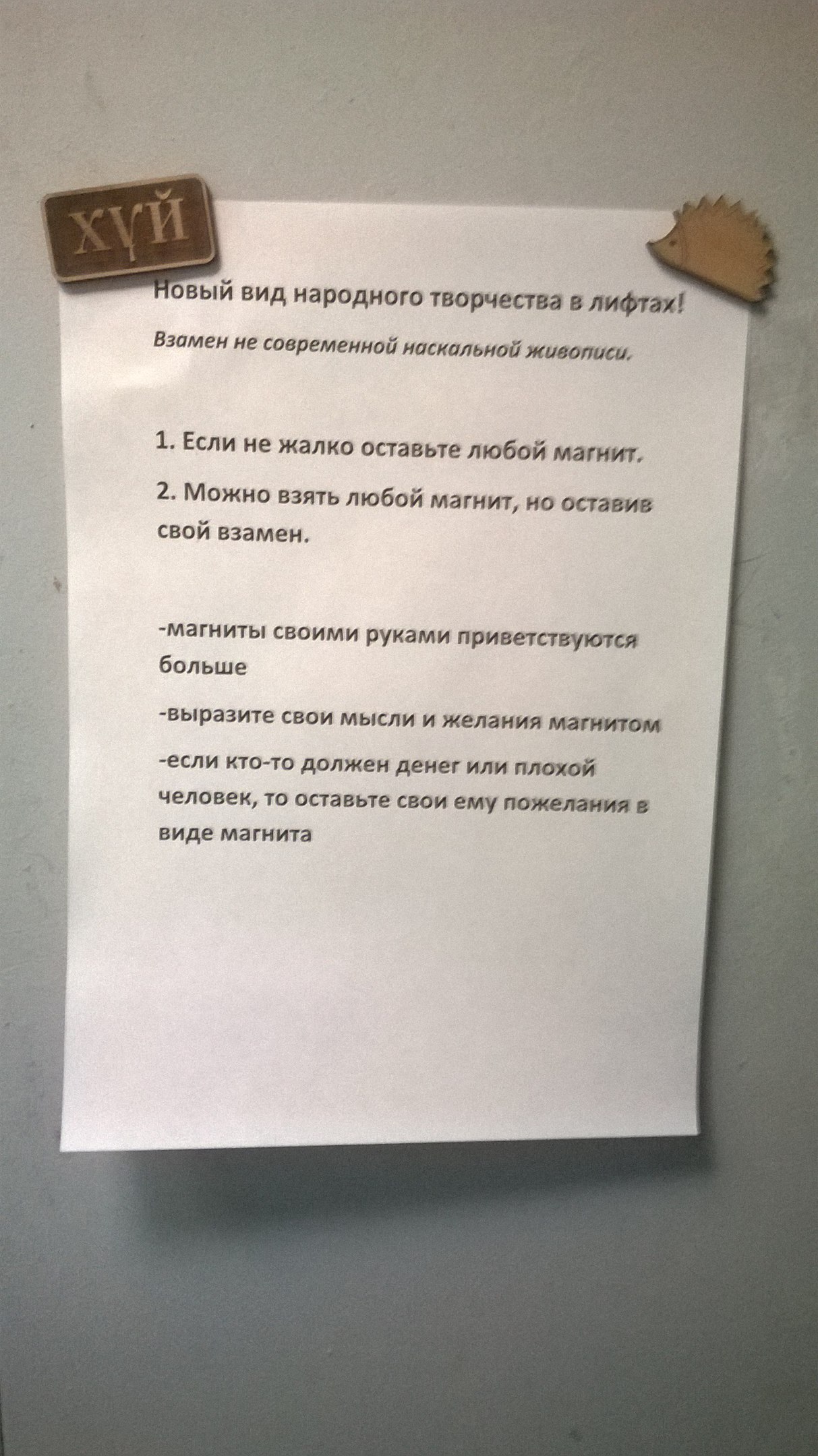 Недавно ком. службы покрасили лифт и отмыли его, как тут же начали его исписывать, правда надписи периодически все-таки отмывают. Поэтому в продолжение магнитной темы, предложу посетителям нашего лифта выражать свои чувства таким образом. Посмотрим, что из этого выйдет.