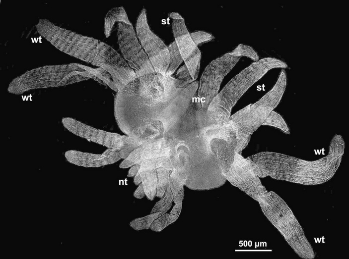 Находясь внутри рыбьего яичка личиночка развивается будучи вывернутой "мехом внутрь", отчего вся её наружная поверхность состоит из пищеварительного гастродермиса, а весь окружающий мир является едой, как у человеческих детёнышей до 2-3 лет)