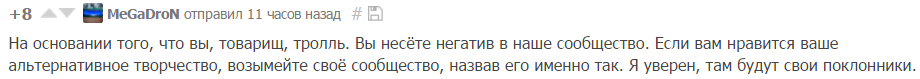 Хамство и троллинг адмодеров и их тематики неприемлемы. Инициатору выдаётся предупреждение и/или бан в сообществе