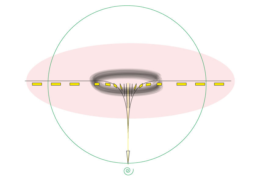 Материя движется по направлению черной дыре (области искривления). Но она никуда не падает вопреки суевериям. Она движется по 3-мерной геодезической линии вперед! Да, вокруг черной дыры есть диск трехмерный - сфера по сути. И тело будет двигаться по кругу. Для нас. Для стороннего наблюдателя. Но тело движется прямо! Как и наша планета. Она летит прямо! Она никуда не поворачивает. Но со стороны видно, что она вращается вокруг Солнца. Чудеса искривления пространства. Так и тут - материя движется прямо, но пространство так сильно искривляется, что лево и право меняются местами. Ну или точнее - схлопываются.